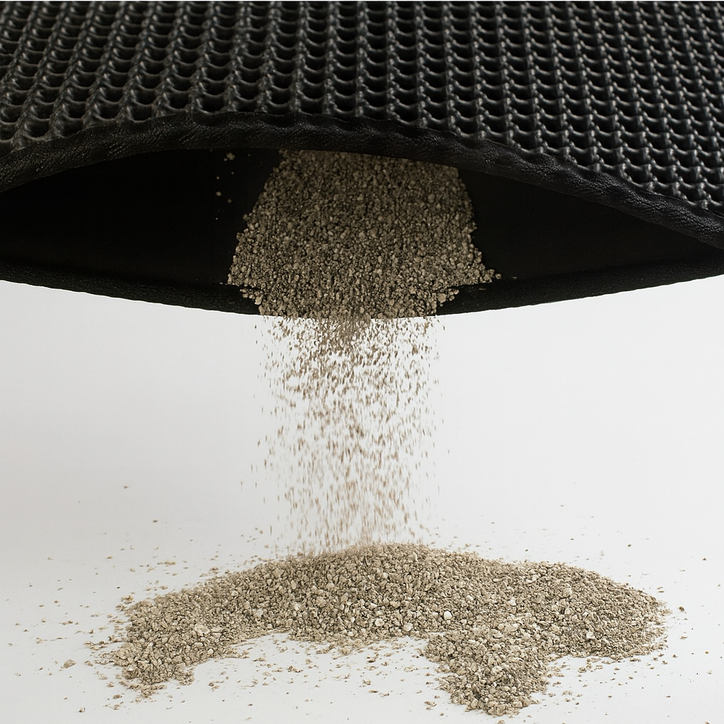 - Let your cat walk across the mat—litter will fall through the holes into the bottom layer.